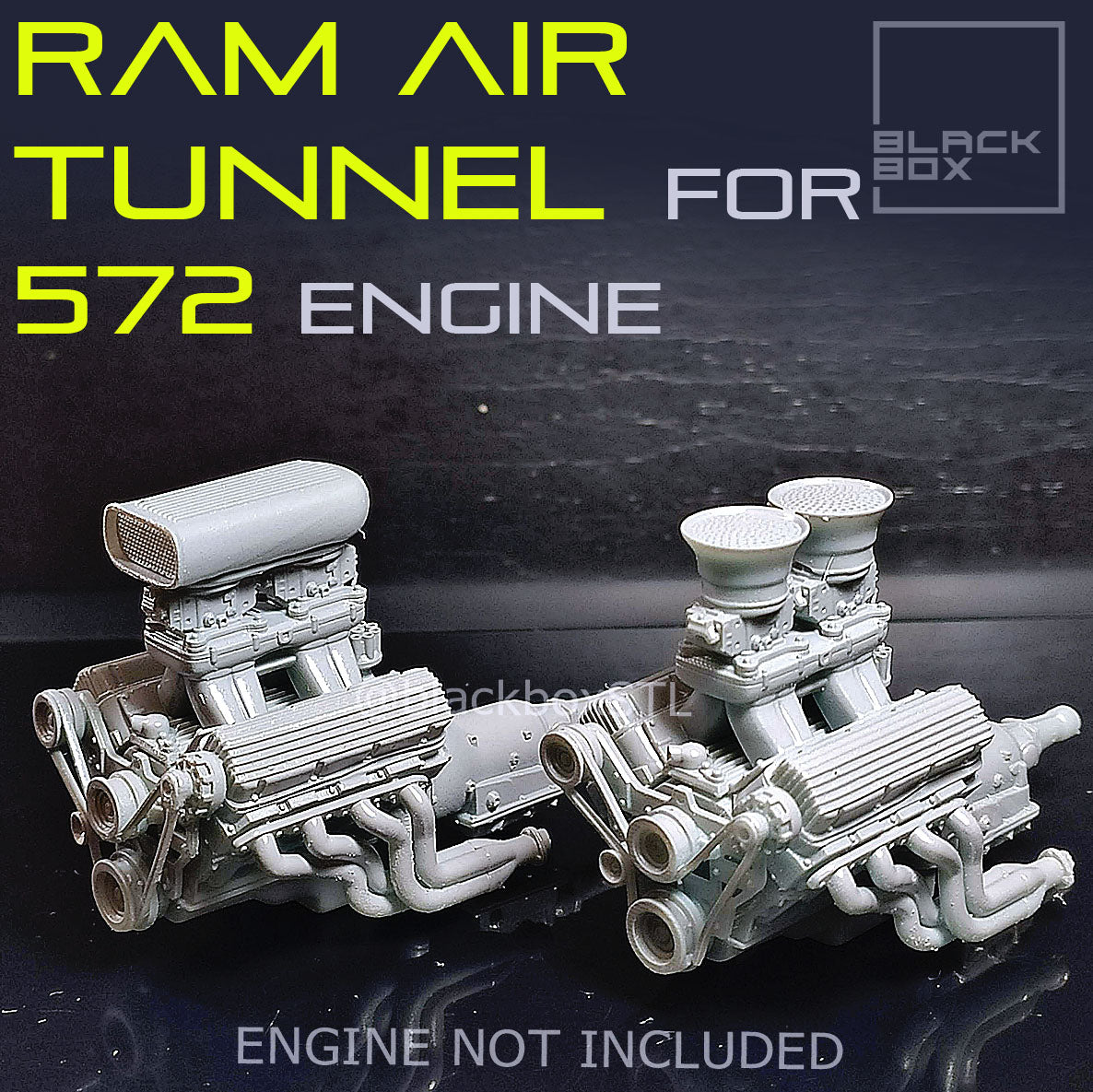 Built for power and presence, this Ram Air Tunnel Set from BlackBoxSTL is an all-in-one upgrade for your 572 engine build. With its aggressive styling and optional configurations, it’s the perfect choice for drag, pro-street, or custom race-inspired projects.
