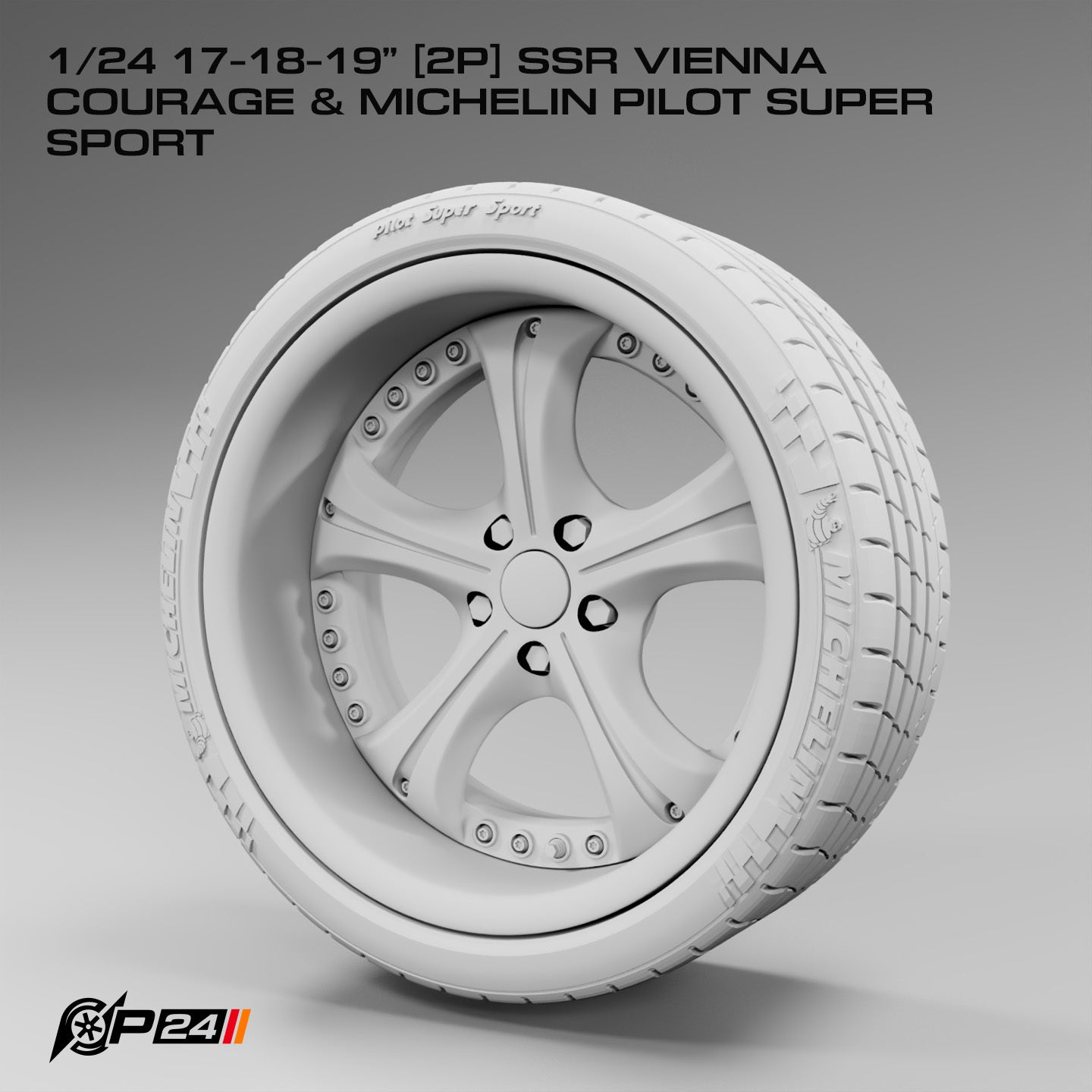Wheels are sold as pairs and feature 2-piece construction for improved realism and easier painting. Each set is paired with Michelin Pilot Super Sport tires, complete with left and right tread patterns. Universal adapters are included for compatibility with major model kit brands.